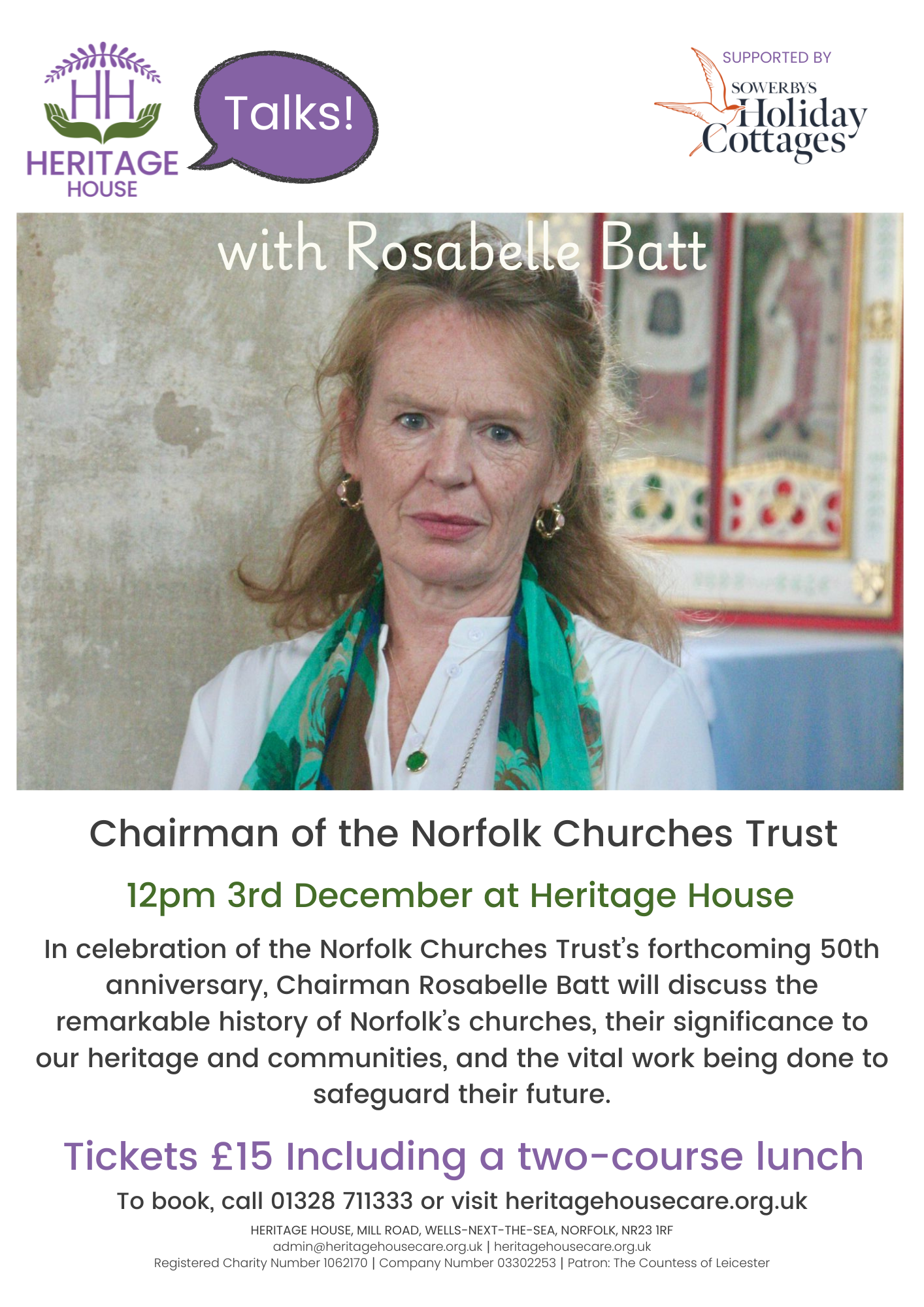 We are thrilled to welcome our next guest speaker, Rosabelle Batt, Chairman of the Norfolk Churches Trust, to Heritage House on 3rd December.